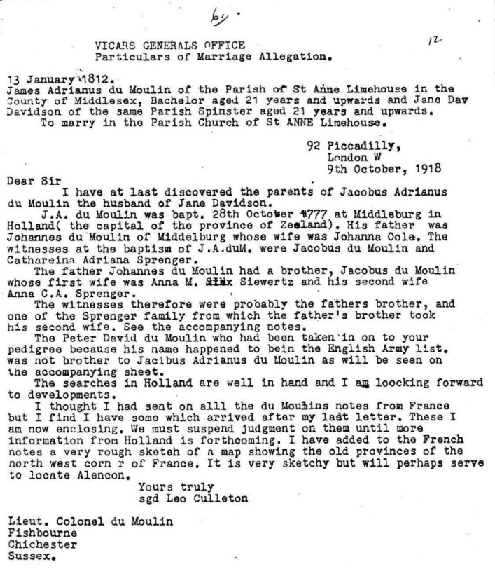 His parents were Johannes du Moulin and Johanna Oole, as set out in a letter dated 9th October 1918 (we do not have the accompanying documents at this stage) written by Lt. Col. du Moulin of Fishbourne, Chichester, Sussex, a New Zealand great grandson of Jacobus who was killed in action just a month later.
