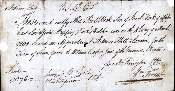Paul Hack with the youngest of the eight children of Jacob Hack & Susanna Bachellier, born on 29 Mar 1784 in London. He signed on as an apprentice printer on 04 Mar 1800 (almost aged 16):