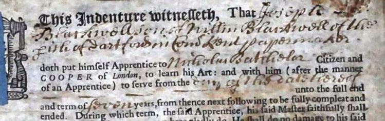 From 1681 protestants in France were forced to convert to Catholicism and this forced many to find safe refuge in London, mainly between Spitalfields in the east and Soho in the west. It is probable that Nicholas and Marie settled in London prior to 1694; the name Nicholas Batcheler appears in the London, England, Freedom of the City Admission Papers, 1681-1925 when, on 07 Oct 1694 when one Joseph Blackwell signed on as an apprentice to him to learn the art of a cooper. Of course this could be a completely different person as a Nicholas Batcheler appears several times in English records of the time.