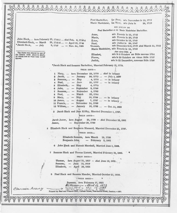 05. Susanna Bachellier married Jacob Hack on 12 Feb 1770 in Bethnall Green. Jacob was born on 09 Jul 1747, his parents being Jacob (who was a weaver) and Mary Jane Heck. He was the only suviving child. As the family tree shows, two younger children both died in infancy: John (b. 23 Feb 1744/5, d. 06 Feb 1746/7 aged 23 months) and Elizabeth (b. 23 Mar 1745/6, d. 13 Apr 1746 aged 3 weeks). In 1779 his occupation was said to be a porkman. Two of their children, James and Francis, became printers, their shop being on the corner of Cullum St & Fenchurst St, London. In 1822 they published a family tree. Three of Paul Hack’s own children were born after publication and were subsequently handwritten in. Notice the comment that their surname had been changed from Heck by someone unknown at the time the tree was printed. Jacob’s christening record on 24 Jul 1747 at St Matthew’s, Bethnal Green, has his surname as Heck.