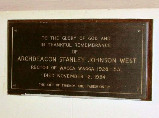 11. Stanley Johnson West married Ivy Dixon on 08 Jun 1913 at Junee, NSW. Ivy was born on04 Oct 1882 at Gundagai, NSW and died on 17 Aug 1973 in the The Haven, Nursing Home in Wagga. Stanley became an Anglican minister and was appointed to St Johns at Wagga, an appointment that lasted 25 years. The church erected a plaque in his honour: