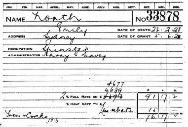 Clara, Ellen, Emily and Ethel did not marry; the four, plus their sister Lucy, lived with their parents at Lynton, Lane Cove Rd, Wahroonga (Electoral Rolls, 1903-4). Probate of Emily’s estate was granted in June, 1928, although to date we have not located her death NSW record . The following image is the index to Emily’s probate record, showing that she lived in Sydney, was not married and died on 23 Feb 1928. The administrator, Harry Davey, was her brother-in-law.