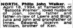 05. Philip John Walker (b. 13 Nov 1912 in Chatswood, d. 18 Apr 1994 in Tamworth) married Joan Elizabeth Walker at Coolah in 1940; they had a son and a daughter; from The Sydney Morning Herald, Sat 23 Apr 1994: