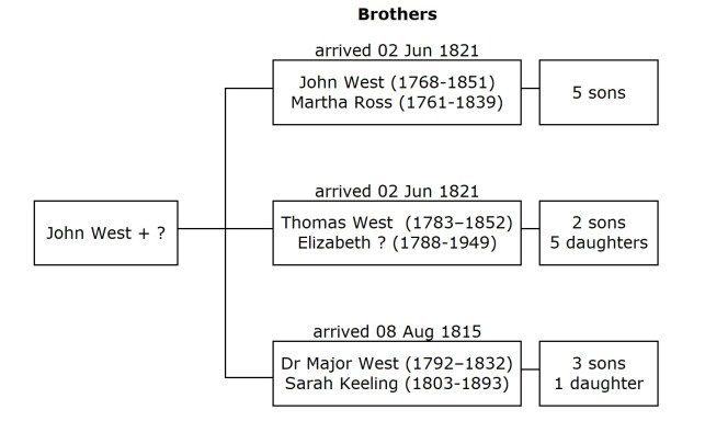 The West family migrated from Londonderry, Northern Ireland, on two separate occasions. There are three Major Wests in the wider family and sorting out the family stories can get quite tricky. The following image might facilitate an understanding of the West family structure: