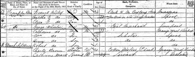 In the 1851 census the family lived at 65 Franklin Place, Everton. George was a coal merchant, they had one “servant” who had been born in Ireland, and Catherine’s brother Charles was visiting (or living with them) at the time:
