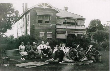 Picnic at Rosemoran. Seated: Mary, Mr Kingsbury (a family friend), Ella, Henry and Maud. On rugs are other friends of the family.